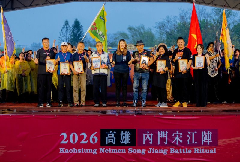 【漾新聞記者陳雯萍/高雄報導】鼓聲震天、兵器交錯,傳統與創意在廟埕交織出最震撼的文化盛宴。2026全國創意宋江陣頭大賽決賽4日在高雄內門內門紫竹寺熱血登場,7強隊伍輪番上陣,最終由「鳳武薪傳—西螺鳳山館」再度奪冠,成功蟬聯寶座,在萬眾矚目中寫下連霸紀錄,為今年賽事劃下最高潮。