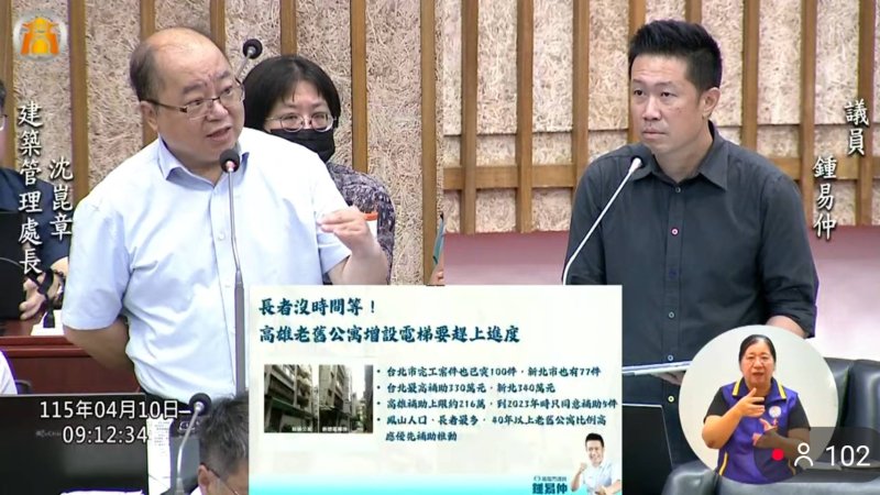 【漾新聞記者陳雯萍/高雄報導】高雄市議會持續進行工務部門質詢,市議員鍾易仲聚焦高齡化社會與老舊建築問題,直指中央推動「老屋延壽」與「增設電梯」政策本為德政,但高雄推動成效明顯落後六都,甚至出現一年僅補助兩件的情況,速度過於緩慢,恐讓長者居住安全與便利性難以提升,要求市府正視問題、加快腳步。