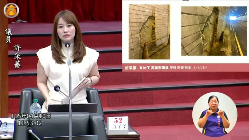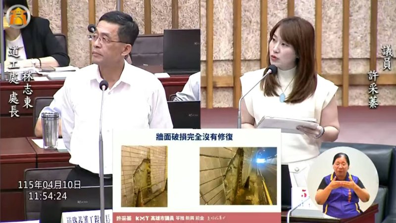 許采蓁於議場中出示去年11月與近期拍攝的現場照片,顯示中正地下道牆面仍存在嚴重滲水、隆起與破損情形。她指出,早在去年會勘紀錄中已明確分工由道工科負責處理牆面修繕,然而當時主責單位未派員出席,至今現場僅以三角錐警示,未見實質改善,質疑相關單位消極應對。