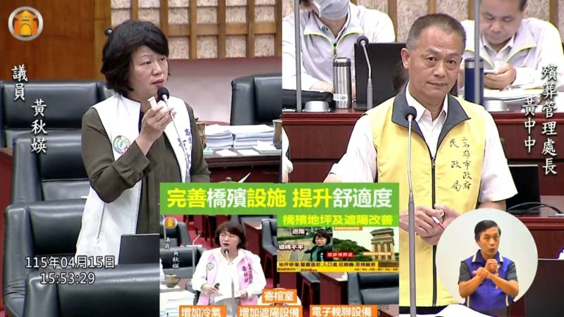 針對橋頭殯儀館與納骨塔設施,黃秋媖指出,民眾近年對冷氣、遮陽與電子輓聯等設施需求強烈,尤其橋頭第二殯儀館禮廳與寄棺室空調設備老舊,夏季使用極不舒適。殯葬處長黃中中表示,目前已完成冷氣更新招標,預計6月中旬前可全數完成;另寄棺室增設案也正進行可行性評估,未來將納入地方意見審慎規劃。至於遮陽設施及電子輓聯,也將視經費與空間條件進一步推動。