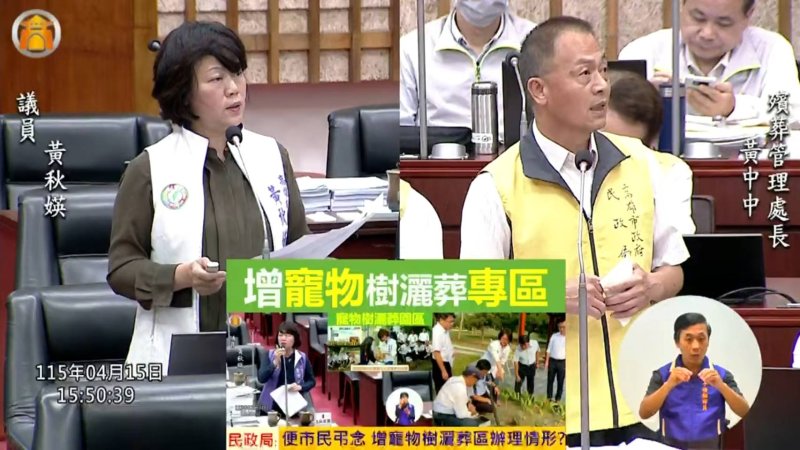黃秋媖也再度關心寵物樹灑葬專區設置。她指出,目前高雄寵物樹灑葬設施集中於深水地區,對市區民眾而言不夠便利,希望市府評估在市區試辦至少一處,讓飼主能更方便地送別陪伴多年的毛小孩,也為殯葬基金創造合理收入。殯葬處長黃中中表示,寵物樹灑葬專區涉及動保業務與法規面向,後續將與動保處橫向協調,參考深水經驗,評估其他地點設置可能性。