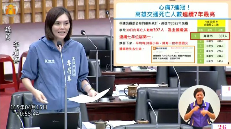 【漾新聞記者陳雯萍/高雄報導】高雄市議會民政部門質詢15日持續聚焦民眾最切身的安全議題。高雄市議員李眉蓁直指,高雄市交通事故死亡人數已連續7年居全國之冠,最新統計死亡307人,平均每28小時就有1名市民因車禍喪命,數字怵目驚心,令人難以接受。她質疑,市府年年檢討、年年公布危險路段,但死亡數字仍高居不下,研考會若僅止於統計與公布,而未深入提出道路風險研究與改善建議,等同束手無策,難以回應市民對宜居城市的期待。