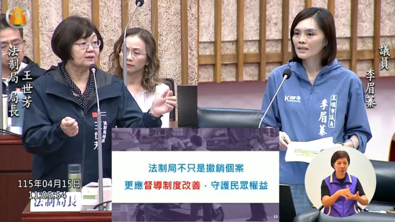 除了交通安全議題,李眉蓁也將矛頭轉向法制面,指出高雄市訴願審議案件中,警察局案件數最多,且撤銷件數也居首。依業務報告顯示,訴願審議總件數1167件,其中警察局高達270件;而撤銷案件共287件,警察局就占87件,比例偏高,令人質疑是否存在「為罰而罰」的問題。她直言,警察局每年交通罰款收入都超過預算,卻又有相當比例裁罰被撤銷,難免讓民眾產生政府是否在「搶錢」的觀感。