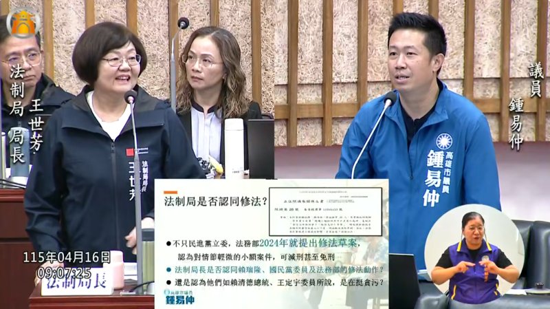 面對尖銳提問,高雄市政府法制局局長王世芳回應表示,「修法不代表認同貪污」,並強調此次修正主要是讓法官在面對情節輕微案件時,能有減輕或免除其刑的裁量空間。然而在鍾易仲進一步追問,是賴瑞隆等人「挺貪污」,還是賴清德與王定宇「抹黑」時,王世芳一度苦笑,僅表示法制局為執行單位,依法配合立法院修法內容辦理,未正面選邊,引發議場關注。