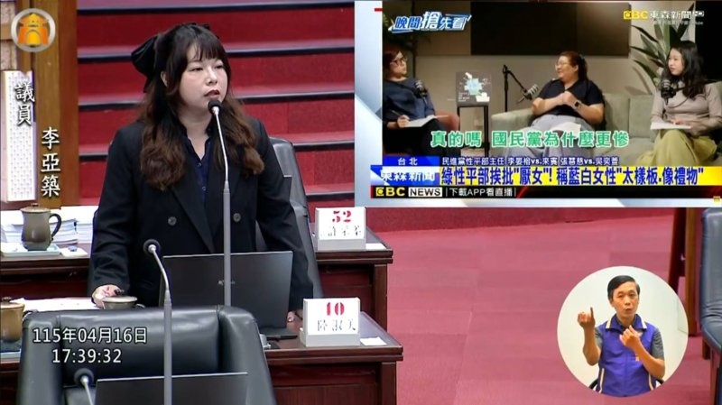 整場質詢,從敬老卡、公托、長者照顧、社安網,到工安與移工議題,李亞築火力全開,但最引發關注的,仍是她對女性遭物化言論的強烈反擊。她以一句「我像禮物嗎」將問題直接丟回執政團隊面前,不只是為自己發聲,也將女性政治人物在公共場域中應享有的基本尊重,再度推到鎂光燈下。