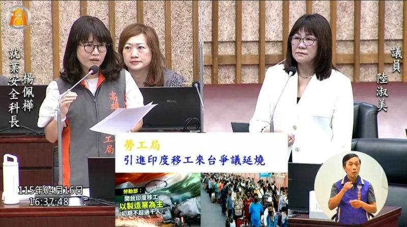針對勞動部擬引進印度移工議題,議員陸淑美提出數據指出,全台移工人數已超過86萬人,失聯人數高達9萬,衍生治安與交通安全疑慮,要求市府向中央表達反對立場,並與高雄市政府警察局合作加強查緝。高雄市政府勞工局表示,將彙整地方意見反映中央。同時,針對職場霸凌申訴機制,勞工局說明可透過1999專線反映,陸淑美則建議設置專責申訴專線,即時提供協助。