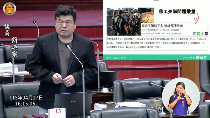 簡煥宗首先指出,依去年審計單位檢討資料,截至去年7月,高雄市失聯移工人數已接近3000人,而若從近年數字來看,2022年約3000多人、2023年約5500人、2024年約4200多人,顯示失聯移工問題始終存在,且主要集中於傳統製造業及家庭看護工兩大類別。他當場詢問高雄市政府勞工局,掌握到的2025年最新失聯移工人數究竟多少。