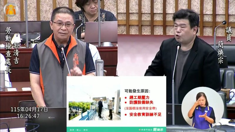 質詢中,簡煥宗也關注工安問題,指出高雄正值城市轉型與大規模開發期,包括美術館區多處高樓建案、左營與鼓山開發案,以及九如橋等重大公共工程,都在持續進行。他提醒,過去美術館區就曾有建案頻繁出狀況,未來隨著更多大型工程啟動,勞工安全更不能掉以輕心,因此詢問勞工局與勞檢處,是否已對這些重大工地建立固定檢查頻率。