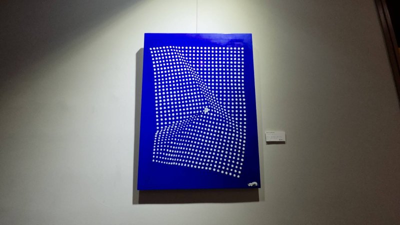 另一幅設置於走道空間的作品,則以藍色為基底,在大小不一的點點排列之中,透過不同間距與組合方式,創造出強烈的視覺錯位效果。點與點之間的關係在畫面中產生微妙變化,彷彿將空間進行折疊與延展,使原本平面的構圖瞬間轉化為具有深度與立體感的視覺經驗。觀者在移動觀看時,更能感受到畫面隨視角轉換而產生的變化,進一步強化作品在空間感與結構表現上的多重層次。