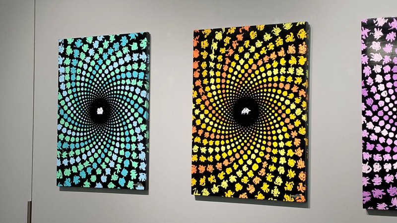 而同樣位於展場大廳的另一幅作品,則透過不同色澤的點點進行有序排列,從淺色逐漸過渡至深色,層層堆疊出一種細膩且富節奏感的流動視覺。這種由色彩深淺所引導的變化,不僅讓畫面產生如波動般的律動,也進一步為畫作注入時間推移的感受,使靜態的平面呈現出彷彿流轉不息的動態張力,整體畫面在秩序與變化之間取得平衡,展現出豐富的空間層次與無盡的想像空間。