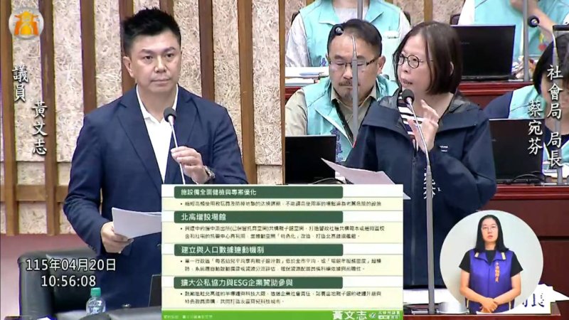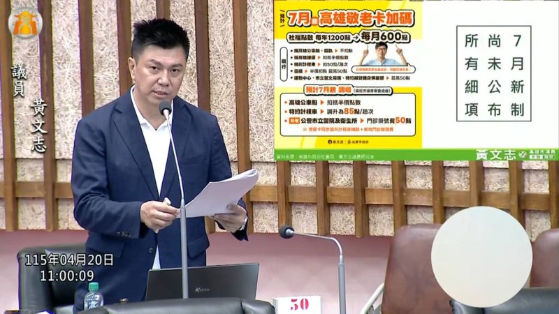 質詢後半段,黃文志則針對敬老卡新制提出多項檢討建議。他指出,現行敬老卡每年1200點,7月起將改為每月600點,等於一年7200點,並擴及公營醫院、衛生所門診掛號費及特約計程車,計程車折抵上限也將由50點提高至85點,整體方向值得肯定;但若新制上路後,原本公車、公車、輕軌等免費或優惠方式改為點數半價扣抵,恐對偏鄉長輩與高使用者造成影響。