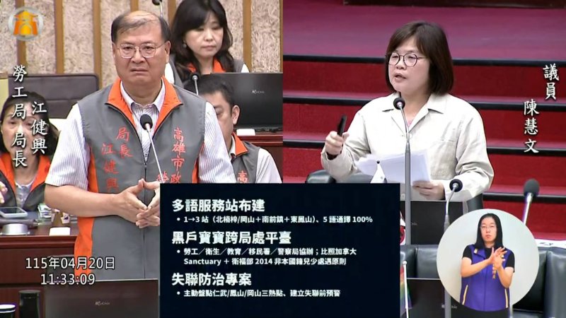 在勞工服務面,陳慧文也要求勞工局檢討多語服務站布建不足問題。她指出,高雄目前外國人服務中心僅1處,服務密度在六都中偏低,建議至少增設岡山、鳳山等據點,形成北高雄、南高雄及鳳山3處多語服務站,提升移工諮詢、生活協助與權益保障量能,讓合法來台工作的移工感受到友善與支持,也降低走向失聯的風險。