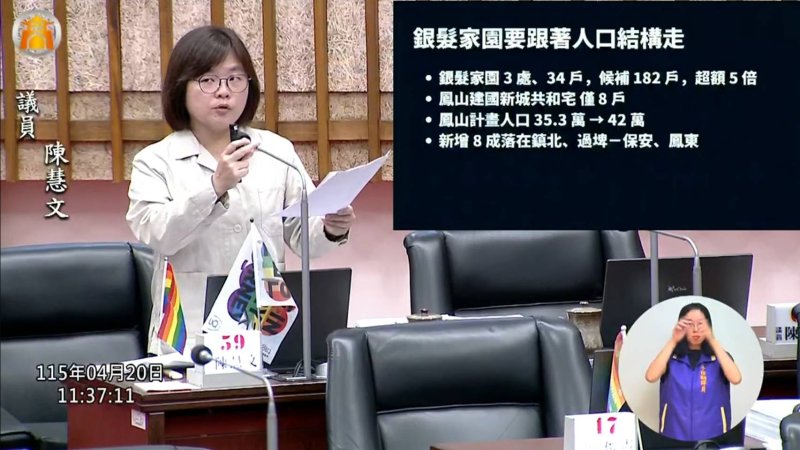 除了移工與兒少議題,陳慧文也關心高齡與托育需求。她指出,目前高雄全市僅3處銀髮家園、共34戶,卻已有182戶候補,需求明顯高於供給。以鳳山為例,建國新城僅8戶,未來鳳山人口有望達42萬,鎮北、過埤、保安、鳳東等新興重劃區卻仍看不到銀髮家園規劃,要求社會局應加速盤點與中央社宅資源爭取。蔡宛芬答詢表示,社會局正持續向中央爭取社宅結合銀髮家園,希望逐步紓解需求壓力。