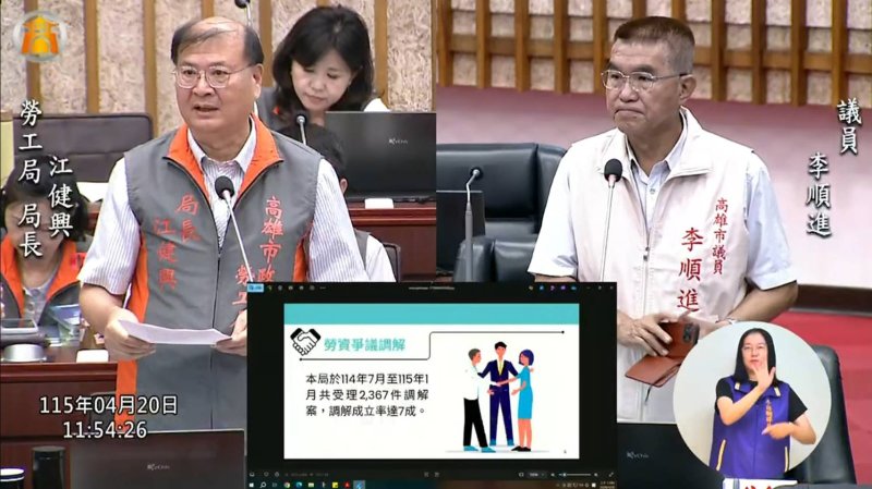 高雄市勞工局長江健興說明,目前勞資爭議調解分為三種模式,包括民間團體指派調解人、主管機關指派調解人及調解委員會調解,其中民間調解成功率約73%、調解人調解成功率約65%、調解委員會亦達約65%,整體表現穩定。