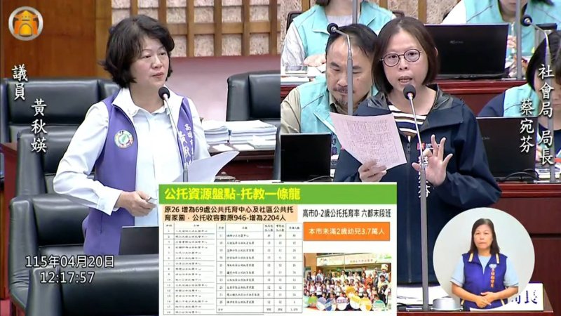 針對臨托服務,黃秋媖進一步指出,北高雄工業區密集,就業人口多且輪班制普遍,對夜間臨托需求殷切,但目前規劃仍不足,盼市府加速布局。她並提到,目前臨托收費在補助後約1160元,已相對平價,但仍應持續朝更友善方向調整。