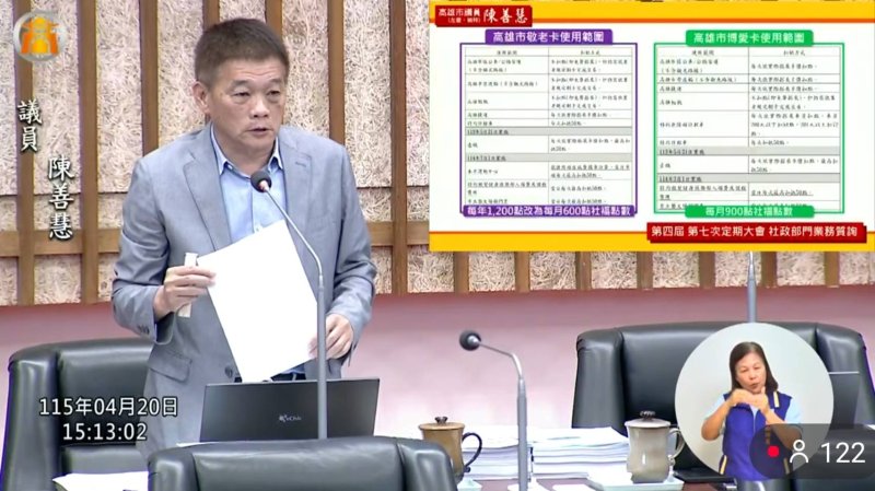 陳善慧指出,高雄敬老卡預計7月起由現行年1200點提升為每月600點,等於全年7200點,方向值得肯定,但若原本搭乘大眾運輸多數不扣點,未來改為公車、公車、捷運扣抵半價,對部分長輩而言反而可能產生負擔。他以高大特區長輩就醫為例,若需搭紅線捷運再轉公車,一趟來回便要連續扣點,點數很快就會用完,因此建議社會局與交通局研議將199月票制度與敬老卡點數結合,讓長輩搭乘公共運具更便利。