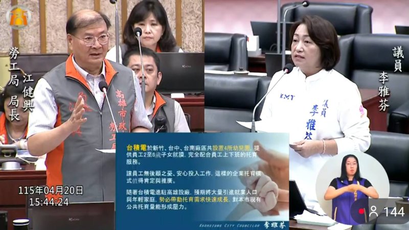 對此,高雄市勞工局長江健興表示,目前高雄市補助主要仍是協助企業申請勞動部相關經費,勞工局也扮演輔導角色,協助企業了解與申辦補助。對於李雅芬點名台積電等大型企業,他回應會主動了解與輔導,也認同高雄應該比照其他科技重鎮,積極推動企業端的托兒與托嬰設施。