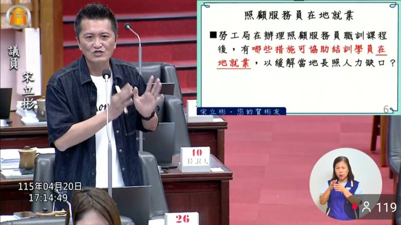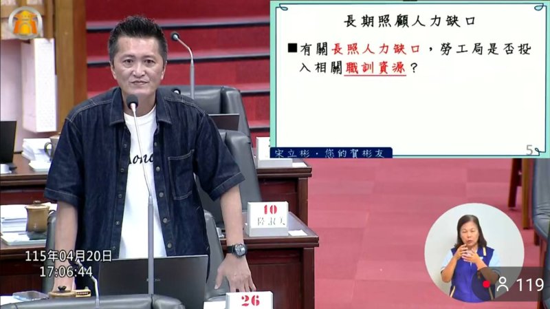 不過宋立彬進一步追問,高雄市每年到底真正需要多少長照人力?若依衛生局統計,目前需求約2000多人,照理說每年訓練1000多人、就業率又超過8成,缺口不應如此明顯。他直言,問題就在於拿到證照不代表持續從事長照,有人做1個月、2個月、3個月就離職,或根本未實際投入職場,導致數字與現實脫節。