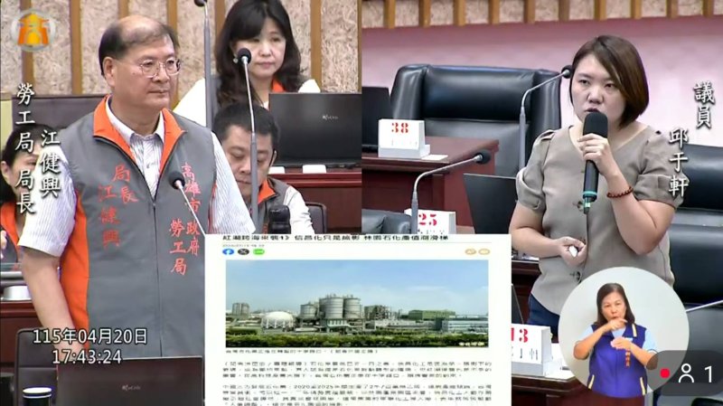 質詢中,邱于軒也延伸關注產業勞動環境問題,指出近期石化產業傳出人事調整與停工消息,勞工人心不安,呼籲勞工局應強化對產業動態的掌握,提前規劃就業媒合與轉職訓練機制。她表示,包括林園工業區等地若出現產線縮減或優退方案,應即時介入,避免勞工在資訊不透明下承受壓力。
