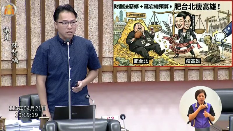 【漾新聞記者陳雯萍/高雄報導】高雄市議員林智鴻今(21)日於市議會財經部門質詢時指出,近期財劃法修正與中央總預算爭議,已使地方財政分配出現明顯落差,形成「肥台北、瘦高雄」的不均現象。他直指相關政策導致社福資源差距擴大,並批評政治操作凌駕公共利益,要求市府儘速盤點衝擊並提出因應對策。