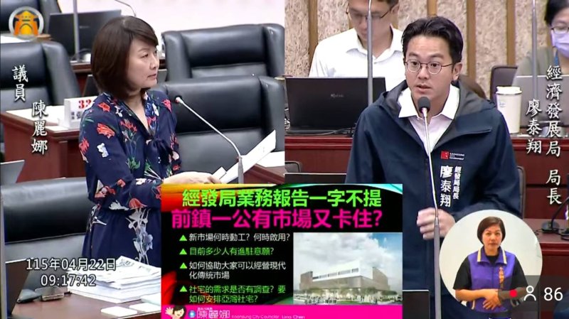 陳麗娜指出,前鎮第一公有市場歷經多年推動,是重要市政建設,卻未在經發局業務報告中出現,令人難以接受。她進一步追問進度與經費執行情形,強調該案總經費2.2億元,去年編列8,000萬元,今年續編,但目前仍停留在公開閱覽階段,質疑是否能如期於明年中甚至第三季完工。