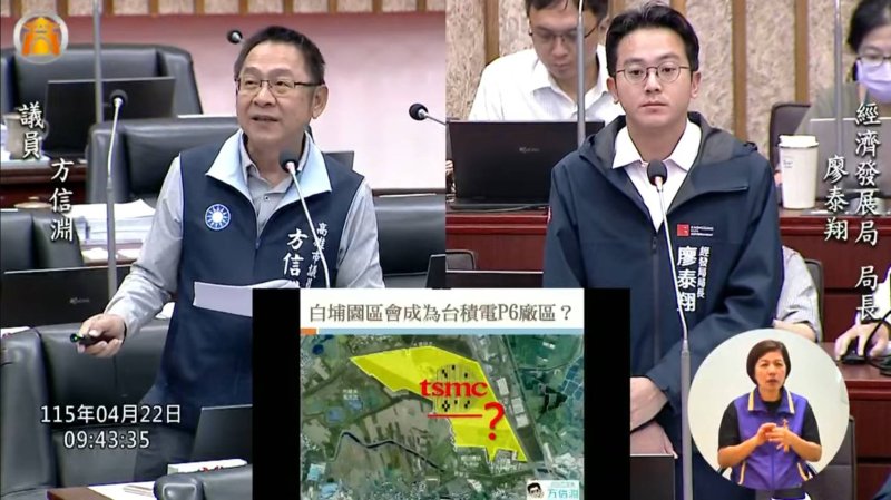 除了交通,方信淵也緊咬招商進度不放。他質疑,白埔產業園區既然已完成報編,市府理應清楚掌握未來究竟要由哪些產業、哪些指標企業進駐,不應只停留在「半導體相關產業」的模糊說法。他甚至追問,台積電未來更先進製程、甚至1奈米或更先進節點,是否可能落腳白埔園區。