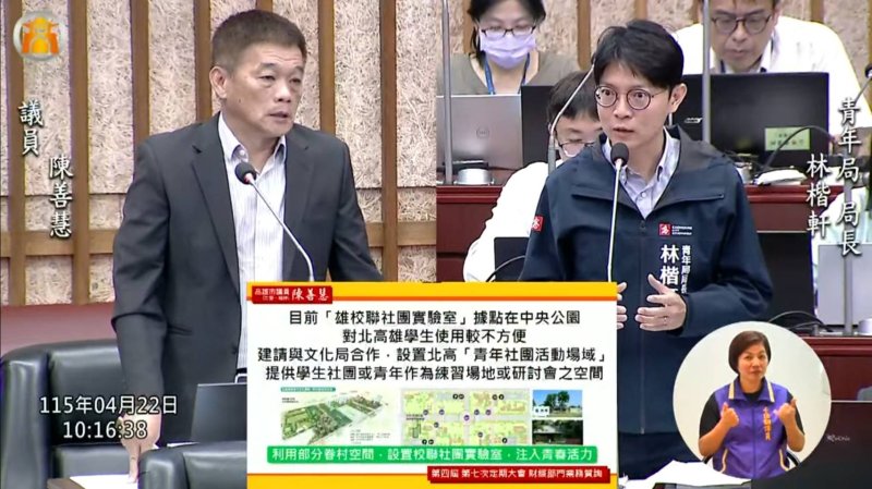 陳善慧指出,目前高雄市「熊校聯社團實驗室」據點設於中央公園,對北高雄學生而言交通不便,建議青年局與文化局合作,在北高雄設置青年社團活動場域,提供學生與青年社團練習、展演及研討空間,讓青年能在地發展。高雄市政府青年局長林楷軒答詢表示,已注意到北高雄需求,將盤點眷村等既有場域,評估設置具大面積空間及鏡面設備的活動場地,作為示範據點。