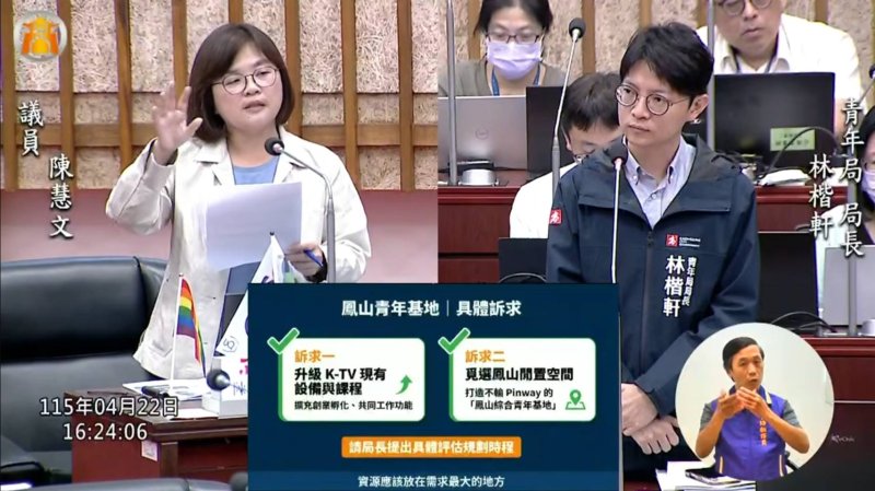 陳慧文同時指出,青年局目前在鹽埕設有Pinway約500坪基地,在新興區設有雄校園8層樓場域,但鳳山僅有KTV新媒體人才培育中心,功能仍以場地租借與課程為主,對人口持續增加的鳳山而言仍顯不足。