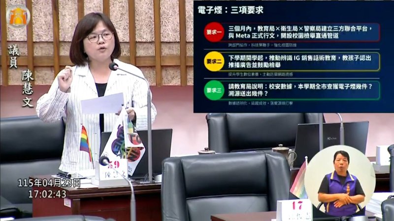 【漾新聞記者陳雯萍/高雄報導】電子煙正沿著社群平台悄悄滲入校園,甚至從高中一路往下蔓延到國中、國小邊緣。高雄市議員陳慧文今(23)日在教育部門質詢時直指,校園電子煙問題已不是零星個案,而是透過Instagram推播廣告、網址下單、超商取貨的完整違法鏈條,卻往往只處罰末端使用的學生,真正推播、販賣與供應者卻難以究責。她要求高雄市政府教育局在3個月內結合衛生局、警察局建立三方聯合平台,並正式行文Meta,開設校園檢舉直通管道,全面攔阻電子煙進入校園。