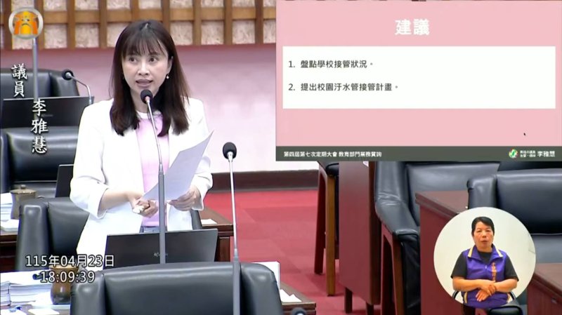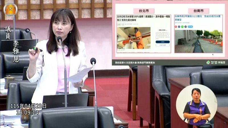 李雅慧強調,污水接管雖屬水利局業務,但校園環境直接關係學生健康與學習品質,教育局不應置身事外。她建議教育局應主動盤點全市學校需求,掌握尚未接管校數、優先順序與工程難度,並與水利局建立跨局處合作機制,協助市府整體規劃預算與施工期程。