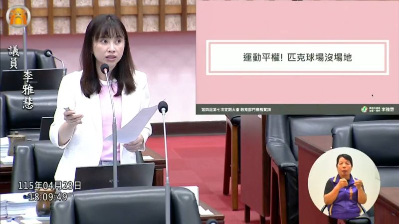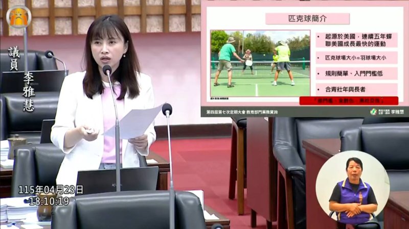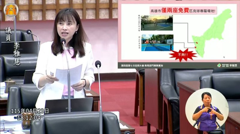 【漾新聞記者陳雯萍/高雄報導】匹克球風潮席捲全球,高雄市議會教育部門質詢中,市議員李雅慧直指,高雄在這項新興運動的場地布局明顯落後。她指出,匹克球自美國興起,連國際流行天后泰勒絲及台灣藝人小S等人皆熱衷參與,近年在國內迅速成長,具備門檻低、老少咸宜與高社交性的特性,深受各年齡層喜愛,但高雄目前僅有2處專屬場地,難以支撐快速成長的運動需求。