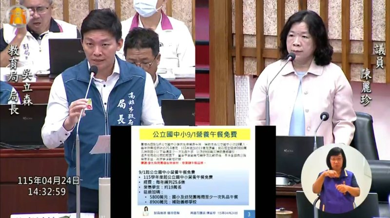 【漾新聞記者陳雯萍/高雄報導】高雄市議員陳麗珍今(24)日在教育部門質詢,聚焦9月1日公立國中小營養午餐全面免費政策,除要求市府把關餐食品質、營養與食安,也為第一線廚工爭取權益,主張寒暑假不應只給半薪,應從六成薪起步並逐年提高,才能穩定人力,避免開學後廚工流失,影響19萬名學生用餐品質。
