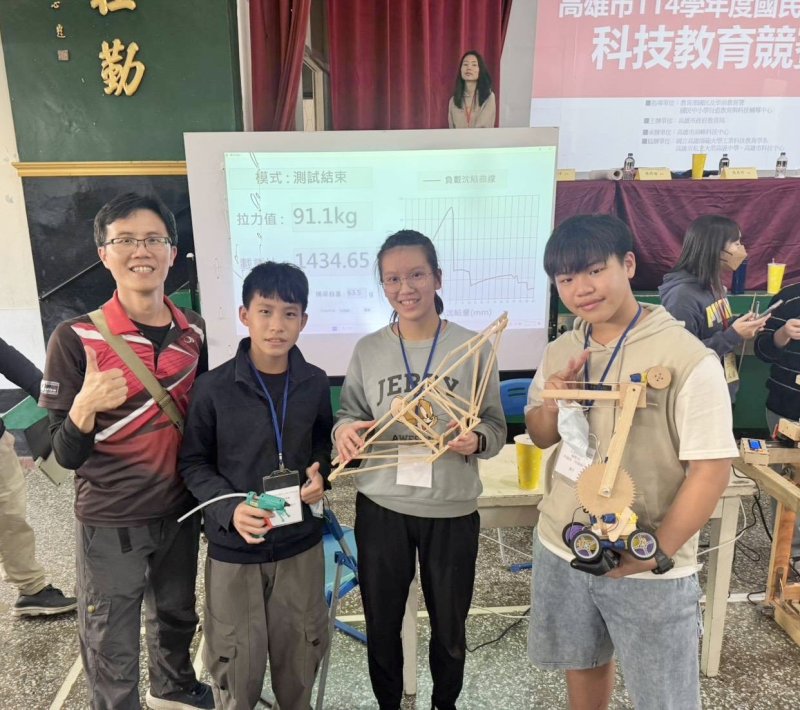 阿蓮國中長期深耕科技教育,在洪于清持續帶領下,已連續15年參與高雄市科技實作競賽,累積「8金4銀3銅」優異成績。本次作品歷經多次測試與修正,在結構強度與穩定性之間取得最佳平衡,展現紮實訓練與團隊合作成果,並創下校史第二度躋身全國前三名的佳績。