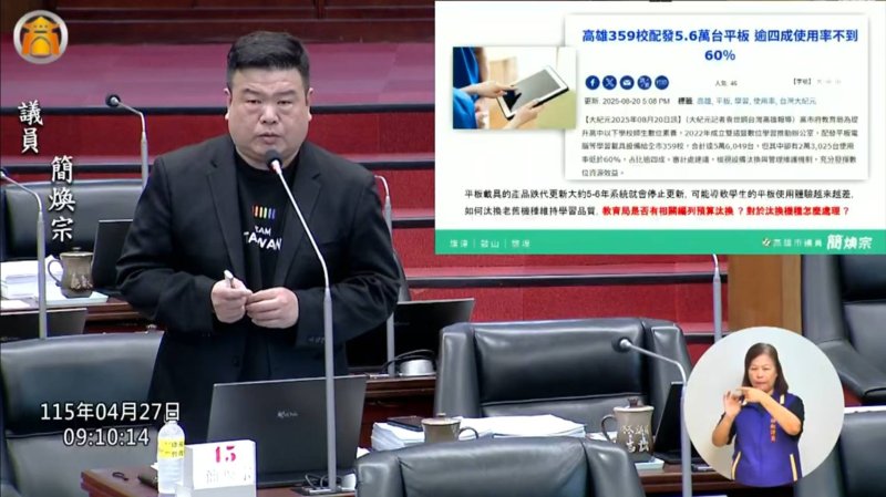 【漾新聞記者陳雯萍/高雄報導】市議員簡煥宗在教育部門質詢中針對「生生有平板」政策提出質詢,指隨著科技快速演進,平板硬體壽命、使用率與汰換處置如何因應?簡煥宗指出高雄已配發大約6萬台平板,但現場使用率僅約四成到六成,擔憂五、六年後大量設備老化引發更新與資產處理問題,並建議研議再利用或捐贈方案,避免資源閒置。