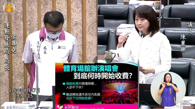 陳麗娜進一步追問政策時程,強調不能讓收費制度拖延至市長任期結束後才上路,形成政策責任轉嫁。侯尊堯明確回應,目前已規劃於5月4日公告,公告後即依程序實施,意味著最快5月起,高雄體育場辦理演唱會將正式進入收費時代。
