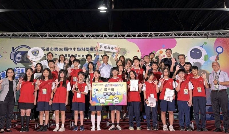 【漾新聞記者陳雯萍/高雄報導】在科學探索的舞台上再創高峰,高雄市立五福國中於第66屆高雄市中小學科學展覽會中表現亮眼,不僅11件參賽作品全數獲獎,更勇奪國中組團體第一名最高榮耀,其中6件作品將代表高雄市進軍全國賽。甫慶祝60週年校慶的五福國中,再添榮耀,為「五福60、幸福磐石、師生同行、精益求精」寫下動人註腳。