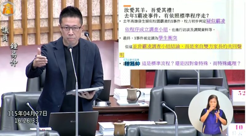 【漾新聞記者陳雯萍/高雄報導】高雄市議會教育部門質詢中,市議員鍾易仲聚焦校園霸凌事件處理程序,要求高雄市政府教育局說清楚疑似霸凌案件從通報、調查到申訴的標準作業流程,並以去年備受關注的「X校園事件」為例,質疑是否確實依程序調查,呼籲教育局面對每一起案件都應依法行政、公平公正,不因當事人背景而改變結果。