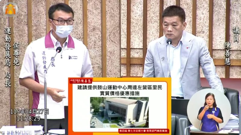 針對鼓山運動中心與左營居民使用權益,陳善慧建議提供實質優惠,並提出社福卡可多人同時扣點使用運動場館的構想。運發局長侯尊堯指出,相關優惠與扣點機制將與社會局研議可行性,以提升市民使用便利性。