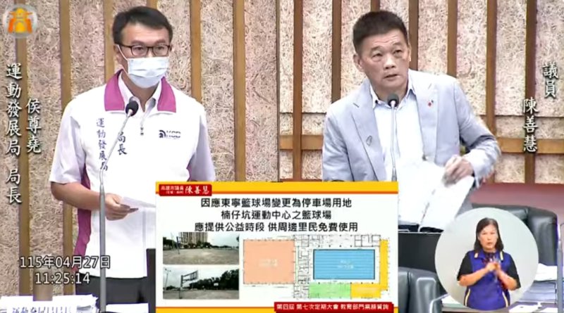 運動設施方面,陳善慧關注楠仔坑運動中心6月營運進度,並要求落實在地回饋,包括公益時段與價格優惠。他同時指出東寧籃球場改為停車場後,運發局應補足籃球場空間。運動發展局長侯尊堯表示,楠仔坑運動中心目前正進行最後整備,將朝如期營運目標推進,並會規劃公益時段回饋地方使用。