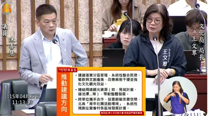 陳善慧指出,左營眷村整建已有初步成果,但缺乏整體藍圖,他建議文化局採分區招商與管理,整合民宿、餐飲及文創產業,避免業態衝突,並串聯見城計畫與蓮池潭等觀光資源,形成完整文化廊帶。他並主張導入銀髮友善空間與青年社團活動據點,讓眷村場域兼具文化保存與公共使用功能。