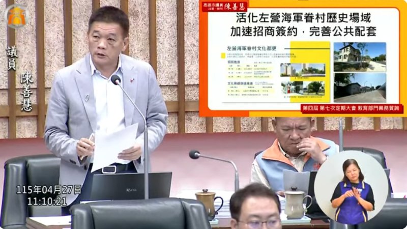 【漾新聞記者陳雯萍/高雄報導】高雄市議會今天(27日)繼續進行教育部門質詢,市議員陳善慧聚焦左營海軍眷村活化議題,強調眷村保存不應止於建物修復,更應導入產業、社福與青年能量,打造具文化厚度與生活機能的歷史人文場域,並要求市府跨局處整合資源,加速招商與系統性發展規劃,同時針對影視行銷、教育資源與運動設施提出多項具體建議。