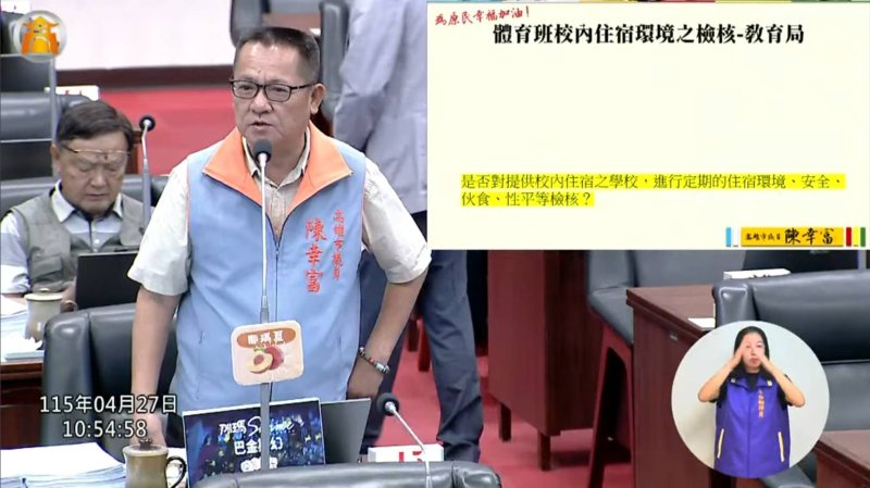 陳幸富指出,高雄市多所體育班設有住宿空間,尤其都會區體育班中有不少原住民學生離鄉受訓,教育局應定期檢核宿舍安全、膳食、門禁與性別友善環境。他特別提到鼓山高中舉重隊宿舍環境,要求市府正視學生住宿品質與隱私安全。