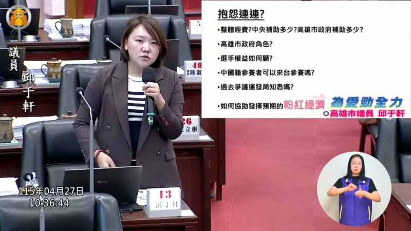 【漾新聞記者陳雯萍/高雄報導】高雄市議會教育部門質詢中,高雄市議員邱于軒針對「亞洲同志運動會」接連爆出報名、賽程及選手入境等爭議,質疑高雄市政府在核定補助及審查機制上是否把關不周,並要求運動發展局提出具體說明與後續補救措施。運動發展局長侯尊堯回應,市府初衷為支持運動平權與多元性別,相關審查已依程序完成,後續將持續協助主辦單位處理爭議,並與中央單位協調相關問題。