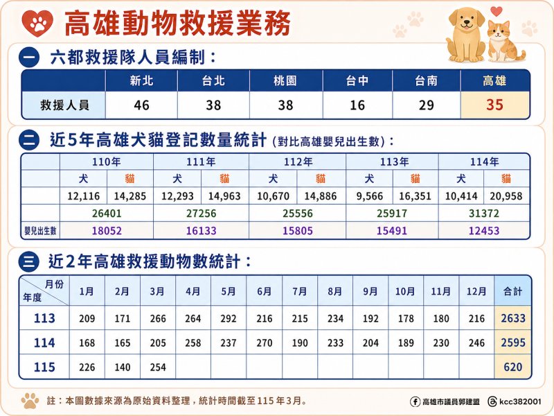 【漾新聞記者陳雯萍/高雄報導】高雄正式邁入「喵城市」世代!高雄市議員郭建盟今(28)日下午在高雄市議會農林部門質詢中指出,2025年高雄貓犬登記數達3萬1372隻,已是新生兒1萬2453人的2.5倍,其中貓咪2萬958隻、占66.8%,5年內暴增47%,動物救援需求同步攀升,要求市府全面優化1959動物救援機制。