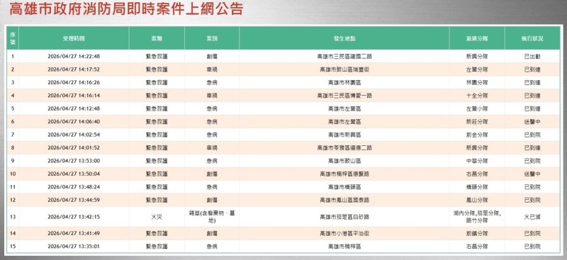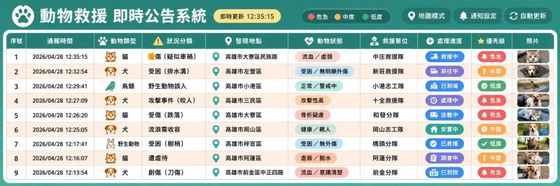 他建議,市府可比照消防局即時案件公開機制,建立「動物救援即時公告系統」,至少公開受理時間、案件類型、發生區域、派遣分隊與處理狀態,讓民眾即時掌握救援進度,降低重複報案,也讓前線調度回到救援本身。