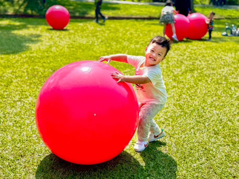 活動現場最吸睛的,莫過於散落於1號與10號球道的「紅咚咚」巨型紅球裝置,隨著風與人群互動,形成一幅充滿生命力的藝術風景;10號球道上的「OB泡泡」體驗區則讓大小朋友穿上充氣裝,在草地上翻滾衝撞,笑聲此起彼落,成為最天然的情緒釋放場。有家長分享,孩子在草地上奔跑與玩耍後「完全不想離開」,自然互動的魅力遠勝精緻設施。