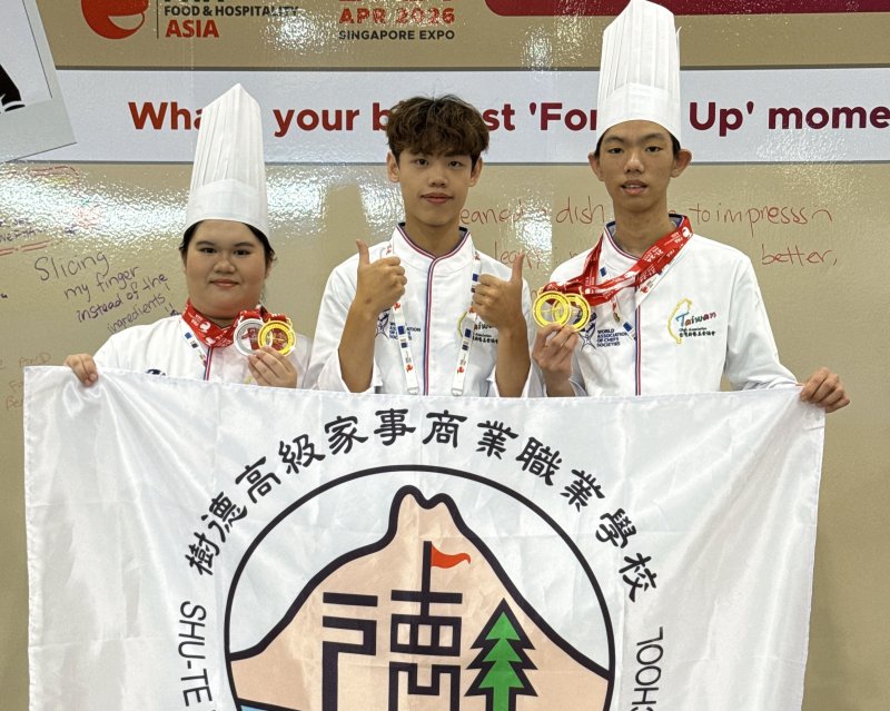【漾新聞記者陳雯萍/高雄報導】來自高雄的餐飲新秀站上國際舞台大放異彩!樹德家商餐飲管理科今年首度遠征新加坡,參加FHA–Food & Hospitality Asia國際廚藝挑戰賽這項世廚認證A級國際賽事,年僅16歲的學生在首度參賽下,一舉奪下3金1銀,寫下驚豔戰績,讓台灣技職教育在國際舞台閃耀光芒。