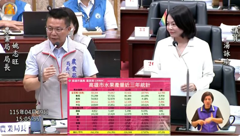 然而,她引用近三年統計數據指出,高雄水果整體產量呈現下滑趨勢,從112年約26萬公噸下降至113年約21萬公噸,減幅達17%。其中芭樂減少18.7%、荔枝減少32.35%、改良種芒果減少45.9%、龍眼減少42.5%、梅類減少20.7%,顯示多項主要作物均出現顯著減產。