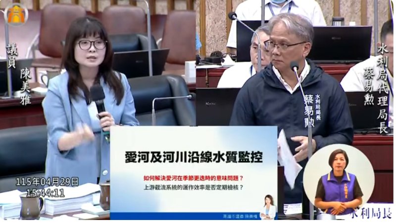 最後,陳美雅重申,愛河及部分河川近來屢遭民眾反映惡臭,疑似有業者偷排汙水,水利局應會同環保局加強查察。蔡易勳表示,愛河異味來源可能包含偷排、淤積與截流系統運作等因素,水利局針對截流系統約每一至兩週清淤一次,重點區域則提高至每週檢測與清理,並將持續配合環保局追查汙染來源。