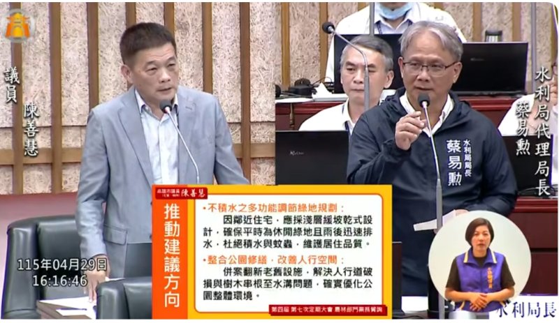 陳善慧進一步關心右昌街489巷及中泰街76巷7弄排水改善工程。他表示,該區鄰近住宅,若規劃滯洪或調節空間,應採淺層緩坡乾式設計,平時作為休閒綠地,降雨時短暫滯洪,雨後快速排水,避免積水、蚊蟲及居住品質下降。